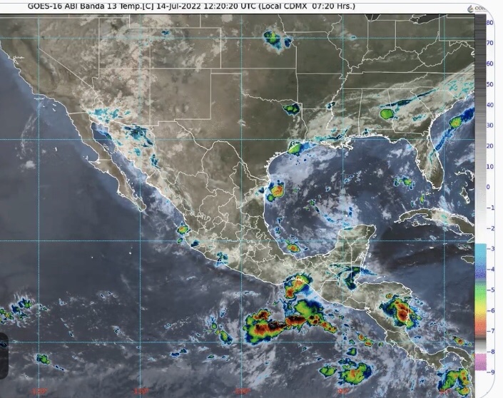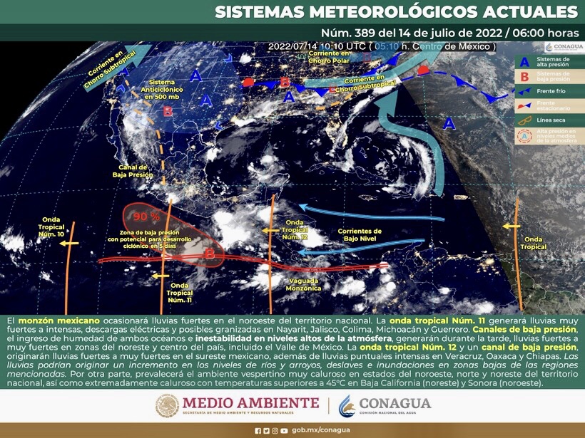 Hoy, la presencia del Monzón mexicano en el noroeste de México, el paso de la Onda Tropical Número 12 por el sureste del territorio nacional, la humedad proveniente de ambos océanos, y canales de baja presión en el suroeste del país y el Golfo de México provocarán lluvias intensas (de 75 a 150 milímetros [mm]) en Chiapas, Colima, Guerrero, Jalisco, Michoacán, Oaxaca y Veracruz; muy fuertes (de 50 a 75 mm) en el Estado de México, Morelos, Nayarit, Puebla y Tabasco; fuertes (de 25 a 50 mm) en Chihuahua, Ciudad de México, Durango, Sinaloa y Sonora; chubascos (de 5 a 25 mm) en Campeche, Hidalgo, Guanajuato, Querétaro, San Luis Potosí, Tamaulipas y Tlaxcala; y lluvias aisladas (de 0.1 a 5 mm) en Baja California Sur, Coahuila, Nuevo León, Quintana Roo, Yucatán y Zacatecas.