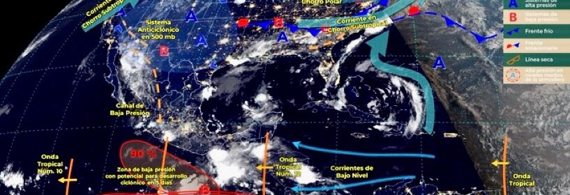 Continúa la vigilancia al sur de las costas de Chiapas y Oaxaca de la zona de baja presión con 70 por ciento de probabilidad para desarrollar un ciclón tropical en el pronóstico a 48 horas sobre el Océano Pacífico. Se localiza aproximadamente a 570 kilómetros (km) al sur-suroeste de Puerto Ángel, Oaxaca, y a 740 km al sureste de Acapulco, Guerrero, con desplazamiento hacia el oeste-noroeste a una velocidad de 16 km/h.