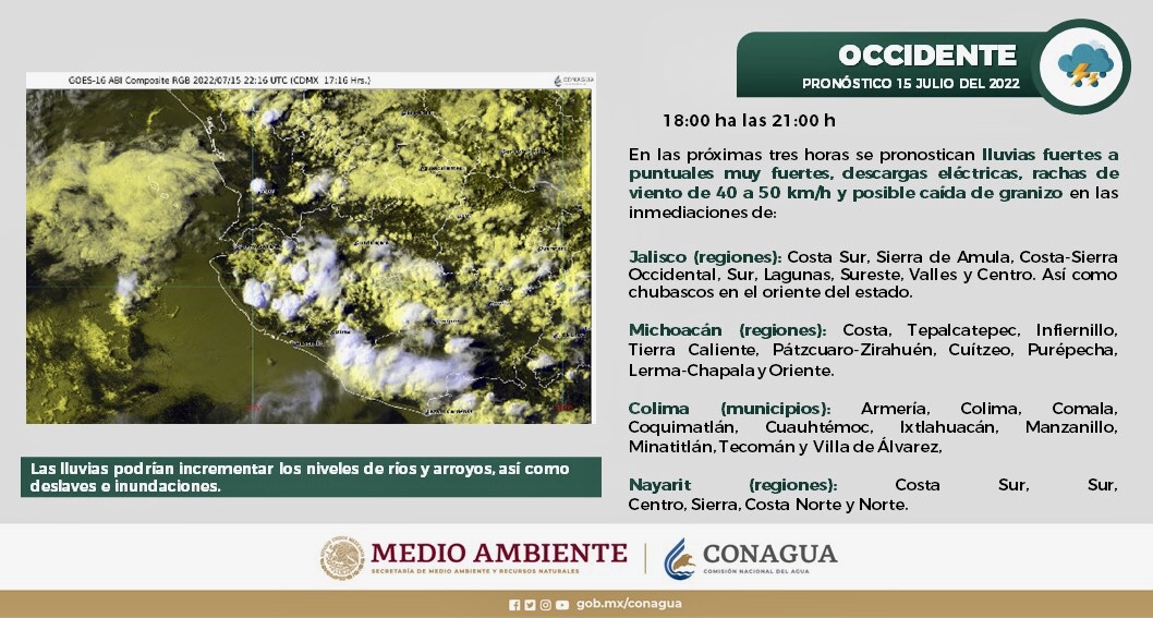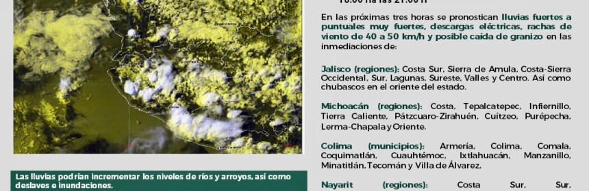 Se esperan lluvias fuertes con rachas de viento en regiones de Colima, Jalisco, Michoacán y Nayarit. Publicado el 15 julio, 2022 por Análisis Colima Deja un comentario Se esperan #Lluvias fuertes con #Rachas de #Viento en regiones de #Colima, #Jalisco, #Michoacán y #Nayarit ⛈️ Compártelo: Haz clic para compartir en Facebook (Se abre en una ventana nueva) Facebook Haz clic para compartir en X (Se abre en una ventana nueva) X Haz clic para compartir en WhatsApp (Se abre en una ventana nueva) WhatsApp Haz clic para imprimir (Se abre en una ventana nueva) Imprimir Haz clic para enviar un enlace por correo electrónico a un amigo (Se abre en una ventana nueva) Correo electrónico Etiquetado con Reporte del clima Clima Nacional Noticias Noticias Colima