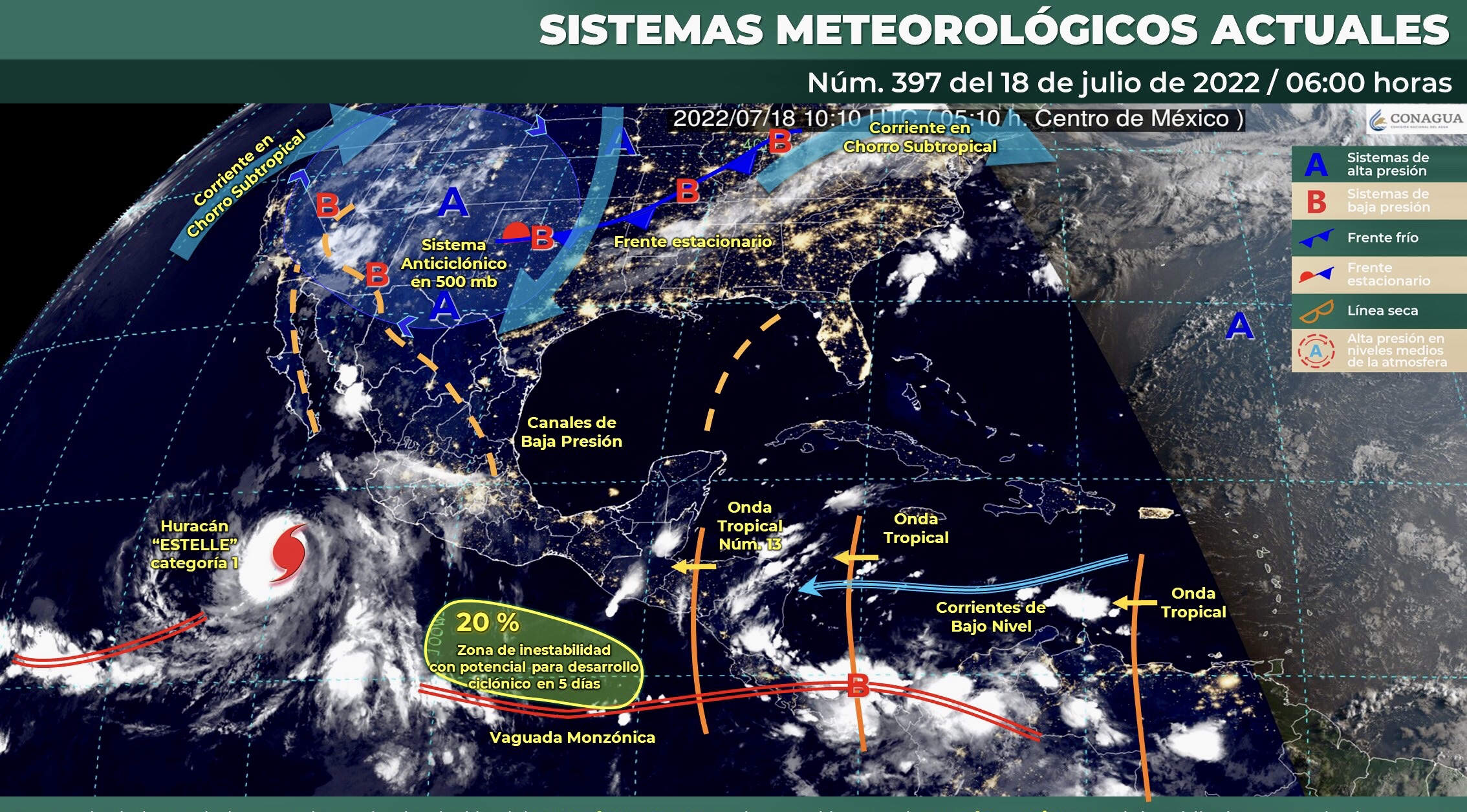 Este día, el centro del Huracán “Estelle” se desplazará al sur de Baja California Sur. La entrada de humedad generada por su circulación en interacción con el monzón mexicano, reforzará las condiciones para lluvias puntuales intensas en Sinaloa, así como lluvias fuertes a muy fuertes en el noroeste y occidente mexicano. Asimismo, se pronostican rachas de viento de 50 a 70 km/h, así como olas de hasta 4 metros de altura significativa en las costas de Baja California Sur, Sinaloa, Nayarit, Jalisco y Colima. Un canal de baja presión se extenderá desde el occidente hasta el centro de México y en combinación con la entrada de humedad proveniente de ambos océanos, ocasionará lluvias fuertes a muy fuertes, tormentas eléctricas y posible caída de granizo en dichas regiones. La onda tropical Núm. 13 recorrerá la Península de Yucatán e interaccionará gradualmente con un canal de baja presión sobre el sureste del territorio nacional, generando lluvias fuertes y descargas eléctricas en Oaxaca y Chiapas. Finalmente, prevalecerá el ambiente caluroso a muy caluroso en estados del noroeste, norte y noreste de la República Mexicana, así como extremadamente caluroso con temperaturas máximas superiores a 45 °C en Baja California (noreste) y Sonora (noroeste).