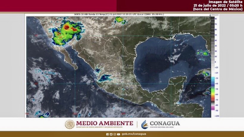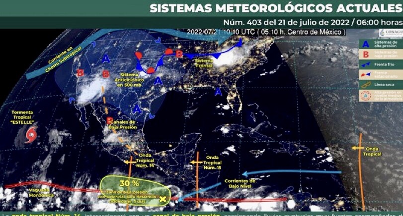Para hoy, la onda tropical Núm. 14 recorrerá las costas del Pacífico Central Mexicano e interaccionará con un canal de baja presión, lo que ocasionará lluvias puntuales muy fuertes acompañadas de descargas eléctricas y posible caída de granizo en Nayarit, Jalisco, Colima, Michoacán y Guerrero. La onda tropical Núm. 15 se desplazará sobre el sur de la Península de Yucatán e interaccionará con otro canal de baja presión sobre el occidente de dicha región, originando probabilidad de chubascos en Quintana Roo, acompañados de lluvias puntuales fuertes en el sureste de México. Por su parte, el monzón mexicano producirá lluvias puntuales muy fuertes acompañadas de descargas eléctricas y posible caída de granizo en zonas de Sonora, Chihuahua, Durango y Sinaloa. Finalmente, se pronostican temperaturas diurnas cálidas a calurosas en gran parte de la República Mexicana, así como temperaturas muy calurosas, superiores a los 40 °C en Coahuila, Sinaloa, Campeche y Yucatán, y con valores máximos extremadamente calurosos, por arriba de los 45 °C, en zonas de Baja California, Sonora, Chihuahua, Nuevo León y Tamaulipas.