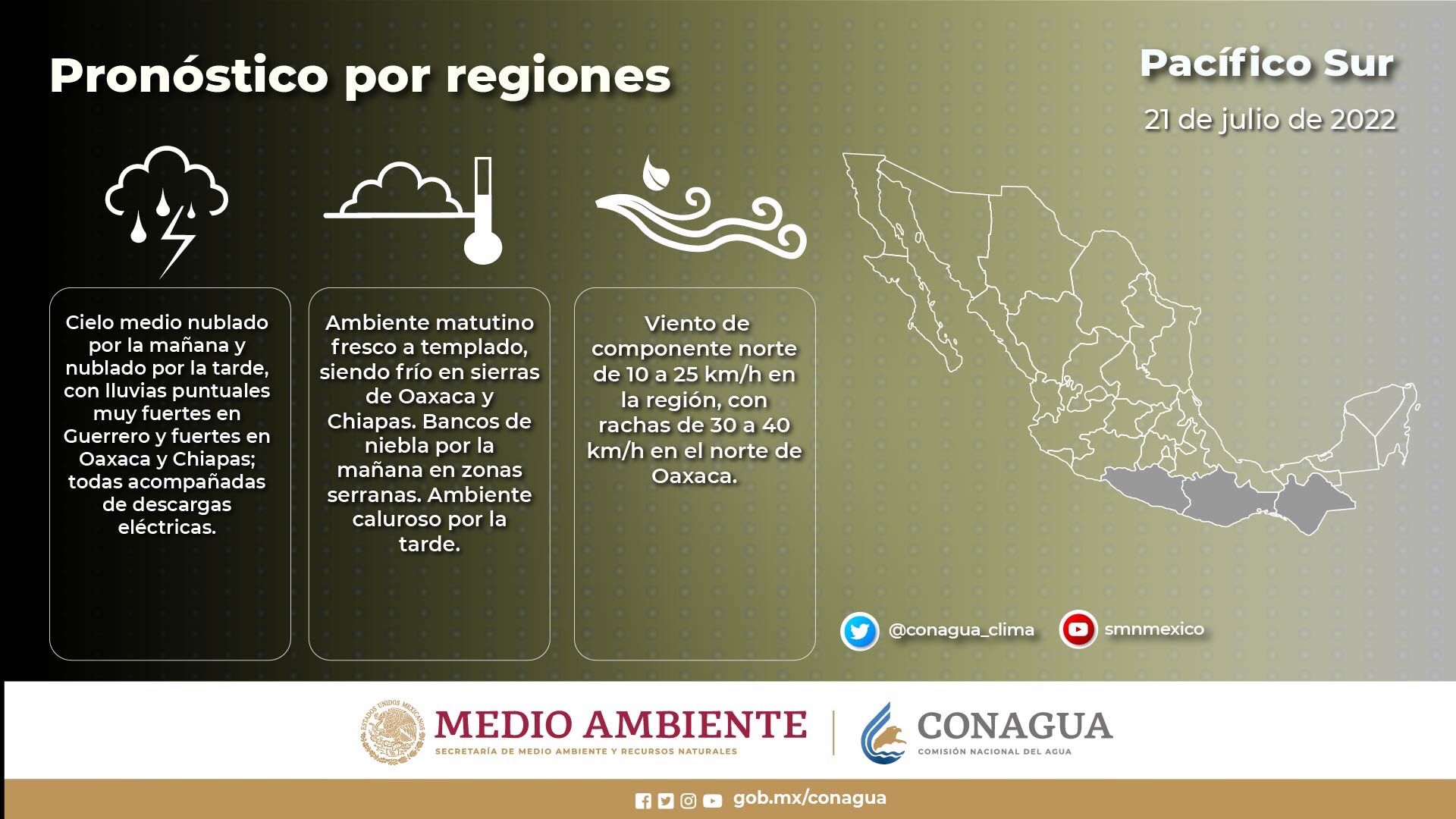 Consulta las condiciones del tiempo que predominarán este jueves en las regiones del #Pacífico norte, centro y sur, así como en la #PenínsulaDeBajaCalifornia. Da clic en cada uno de los gráficos para más detalles