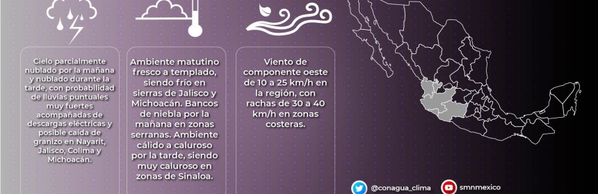 Consulta las condiciones del tiempo que predominarán este jueves en las regiones del #Pacífico norte, centro y sur, así como en la #PenínsulaDeBajaCalifornia. Da clic en cada uno de los gráficos para más detalles