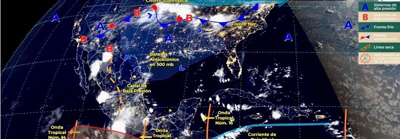 Para hoy, la onda tropical Núm. 15 que recorrerá el sur de la Mesa Central y los estados del sur y centro del Pacífico Mexicano, se asociará con una zona de baja presión con potencial ciclónico, la cual se ubicará al sur de las costas de Guerrero y con inestabilidad en niveles altos de la atmósfera, lo que ocasionará chubascos y lluvias puntuales fuertes en el centro del territorio y lluvias puntuales muy fuertes en Oaxaca, acompañadas de descargas eléctricas, rachas de viento y posible caída de granizo. Por su parte, la onda tropical Núm. 16 reubicada sobre el Mar Caribe, se desplazará sobre la Península de Yucatán y generará chubascos en Yucatán y Quintana Roo y lluvias puntuales fuertes en Campeche. Por otro lado, el monzón mexicano que continuará sobre el noroeste de México, en interacción con un canal de baja presiónextendido desde el occidente de la Mesa del Norte hasta la Mesa Central y con inestabilidad en niveles altos de la atmósfera, producirán chubascos en zonas del noreste de México, así como en Querétaro e Hidalgo; lluvias puntuales fuertes en Guanajuato, Aguascalientes y Zacatecas y muy fuertes en Morelos, Estado de México, Durango, Sinaloa, Chihuahua y Sonora, así como lluvias puntuales muy fuertes a intensas en el sur y occidente de la República Mexicana; estas lluvias estarán acompañadas de descargas eléctricas, rachas de viento y posible caída de granizo, que además podrían incrementar los niveles de ríos y arroyos y generar deslaves e inundaciones en zonas bajas. Finalmente, continuarán temperaturas vespertinas por arriba de los 35 °C en 15 estados, pudiendo superar los 40 °C en Baja California, Sonora, Coahuila, Nuevo León y Tamaulipas.