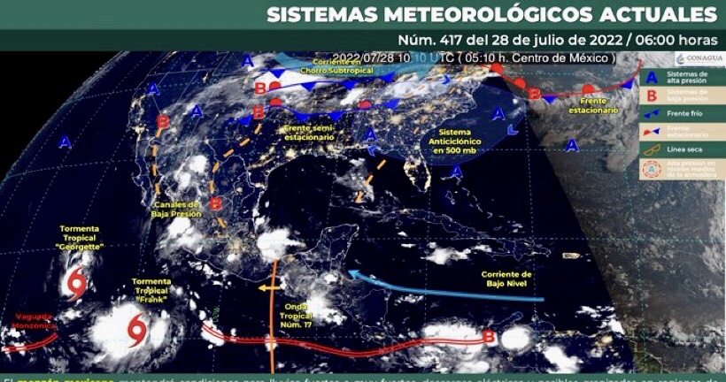 En información tropical, las tormentas tropicales “Frank” y “Georgette” se desplazan sobre el Océano Pacífico sin afectar a la República Mexicana. Para más información, consultar los avisos del Servicio Meteorológico Nacional en: