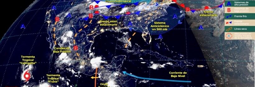 En información tropical, las tormentas tropicales “Frank” y “Georgette” se desplazan sobre el Océano Pacífico sin afectar a la República Mexicana. Para más información, consultar los avisos del Servicio Meteorológico Nacional en: