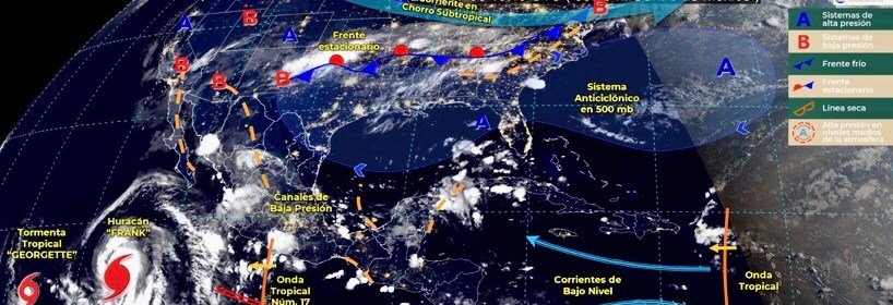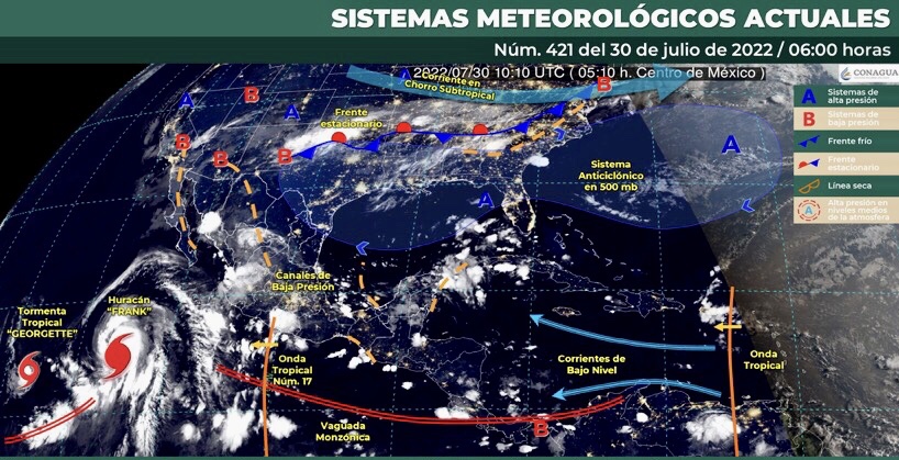 Este día, el monzón mexicano persistirá sobre el noroeste del territorio mexicano y originará lluvias puntuales muy fuertes en Sonora, Sinaloa y Durango, además de fuertes en Chihuahua. Asimismo, un canal de baja presión extendido sobre la sierra madre occidental y la onda tropical Núm. 17 que se desplazará sobre el occidente de México, en interacción con inestabilidad en niveles altos de la atmósfera originarán chubascos y lluvias puntuales muy fuertes sobre el occidente, centro y sur de la República Mexicana. Al mismo tiempo, un segundo canal de baja presión sobre el suroeste del Golfo de México y la entrada de humedad del Mar Caribe, provocarán lluvias fuertes a puntuales muy fuertes en el sureste del país, así como en la Península de Yucatán. Las lluvias estarán acompañadas de descargas eléctricas, rachas de viento y posible caída de granizo. También, continuará el ambiente muy caluroso sobre entidades del noroeste, norte y noreste del territorio nacional, además de valores superiores a 40 °C en Baja California, Sonora, Chihuahua, Coahuila, Nuevo León y Tamaulipas.
