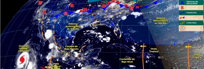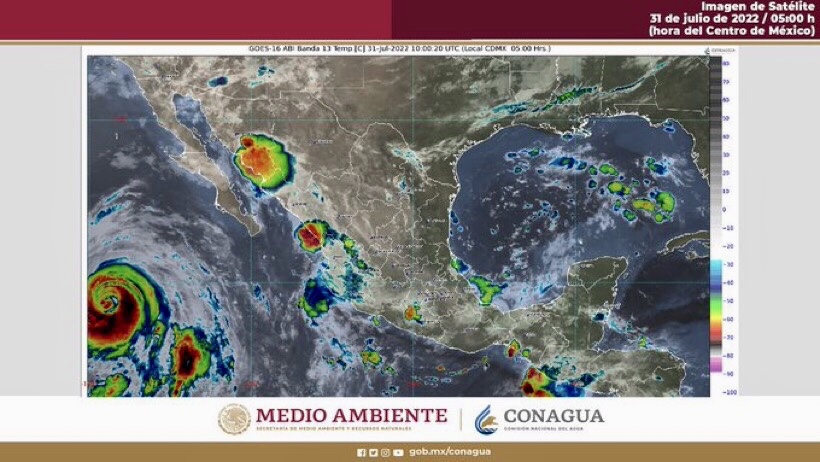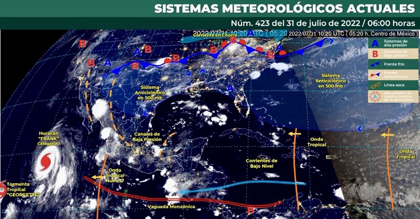 Para hoy, el monzón mexicano sobre el noroeste del territorio mexicano, generará lluvias puntuales fuertes en Sonora, Sinaloa, Chihuahua y Durango. La onda tropical Núm. 17 que se extenderá al sur de las costas de Jalisco y que dejará de afectar gradualmente al país, originarán chubascos en Nayarit y lluvias puntuales fuertes en Jalisco y Colima. A su vez, un canal de baja presión y la entrada de aire húmedo sobre el litoral medio del Pacífico Mexicano, producirán lluvias aisladas y chubascos en los estados de la Mesa del Norte y Mesa Central, lluvias puntuales fuertes en el Valle de México y puntuales muy fuertes en Puebla, Michoacán y Guerrero, las cuales estarán acompañadas de descargas eléctricas, rachas de viento y posible caída de granizo, además de que podrían incrementar los niveles de ríos y arroyos, así como ocasionar deslaves e inundaciones en zonas bajas de dichas regiones. Otro canal de baja presión que se extenderá sobre el Istmo de Tehuantepec y el sureste del país, aunado a la entrada de humedad del Golfo de México y Mar Caribe, ocasionarán chubascos en Tamaulipas, Tabasco y estados de la Península de Yucatán, además de lluvias puntuales muy fuertes en el sur de Veracruz, Oaxaca y Chiapas. Finalmente, persistirá el ambiente vespertino cálido a caluroso sobre los estados costeros del país y entidades del noroeste, norte y noreste de México, con temperaturas muy calurosas que podrían superar los 40 °C, en Baja California, Sonora, Coahuila, Nuevo León y Tamaulipas.