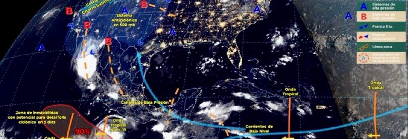 Para hoy, el monzón mexicano mantendrá la probabilidad de lluvias puntuales fuertes en Baja California Sur, Chihuahua y Durango y muy fuertes en regiones de Sonora y Sinaloa; las cuales se acompañarán de descargas eléctricas y posibles granizadas. Por otro lado, el avance hacia el oeste de la onda tropical Núm. 19 y la circulación de un posible ciclón tropical al suroeste de Michoacán, aportarán humedad hacia el pacífico central mexicano e incrementarán las condiciones para lluvias puntuales muy fuertes en Nayarit, Jalisco, Colima, Michoacán y Guerrero. Además, se pronostican rachas de viento de 50 a 60 km/h y oleaje de 1.5 a 2.5 metros de altura en costas de Guerrero, Michoacán, Colima y Jalisco. Asimismo, un canal de baja presión sobre el Golfo de Tehuantepec, producirá lluvias puntuales fuertes en la Península de Yucatán y muy fuertes en el sureste mexicano con lluvias puntuales intensas en Chiapas; todas acompañadas de descargas eléctricas. Finalmente, continuará el ambiente vespertino cálido a caluroso en la mayor parte del país, con temperaturas muy calurosas, superiores a 40 °C, en Baja California, Sonora, Chihuahua, Coahuila, Nuevo León y Tamaulipas.