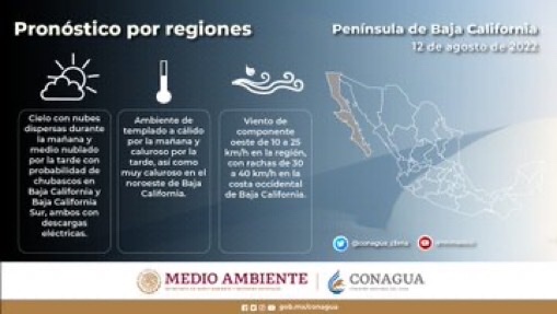 Condiciones del tiempo para hoy en estados del Pacífico y Península de Baja California. Publicado el 12 agosto, 2022 por Análisis Colima Deja un comentario ¡Buenos días! Te informamos las condiciones del tiempo que se esperan para este viernes en la #PenínsulaDeBajaCalifornia y los estados del #Pacífico mexicano Compártelo: Haz clic para compartir en Facebook (Se abre en una ventana nueva) Facebook Haz clic para compartir en X (Se abre en una ventana nueva) X Haz clic para compartir en WhatsApp (Se abre en una ventana nueva) WhatsApp Haz clic para imprimir (Se abre en una ventana nueva) Imprimir Haz clic para enviar un enlace por correo electrónico a un amigo (Se abre en una ventana nueva) Correo electrónico Etiquetado con Reporte del clima Clima Nacional Noticias Noticias Colima