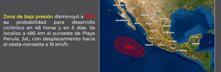 Se mantiene la vigilancia de una zona de #BajaPresión con 70% de probabilidad para formar un #CiclónTropical en 48 horas a 485 km al suroeste de Playa Pérula, #Jalisco