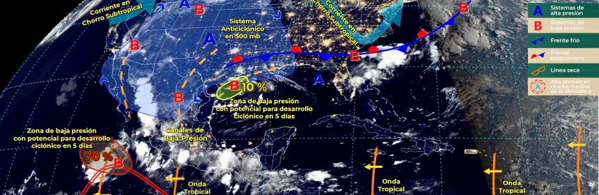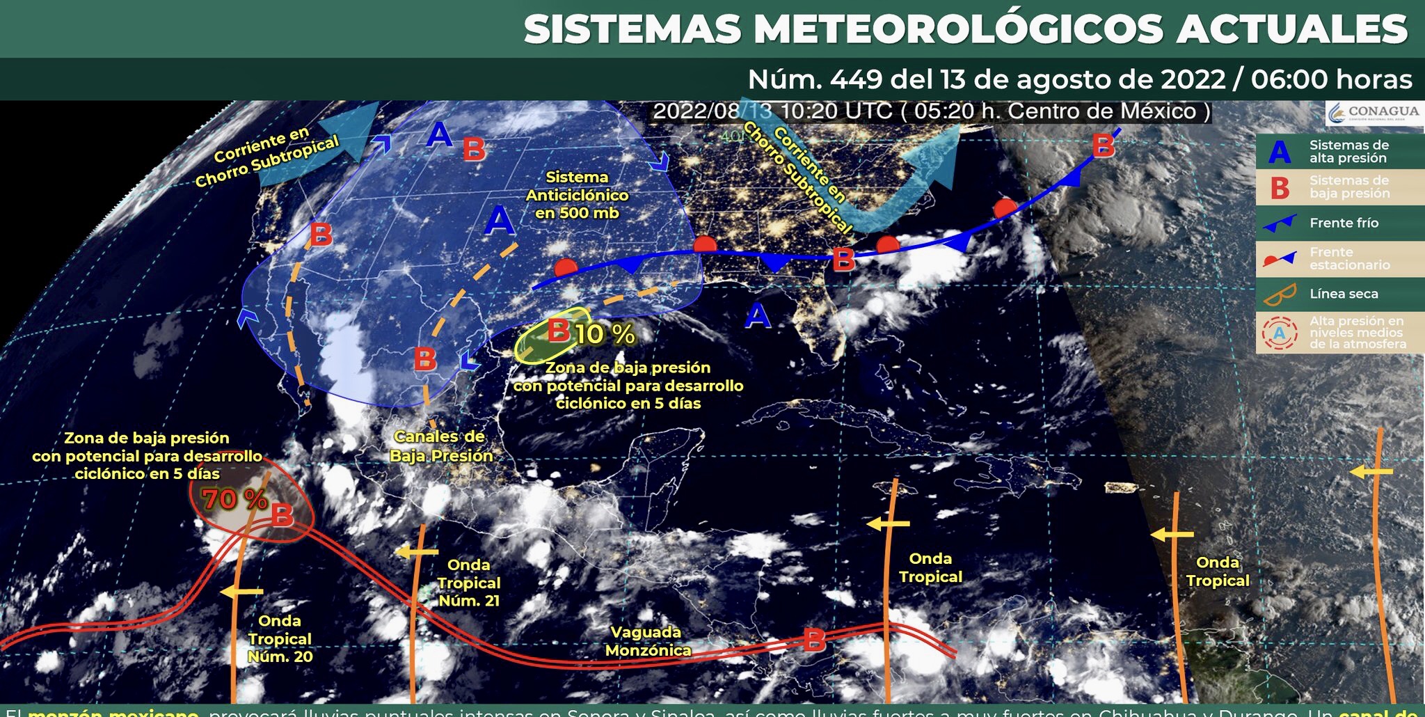 Este día, condiciones del monzón mexicano sobre el noroeste de México, provocará lluvias puntuales intensas en Sonora y Sinaloa, así como lluvias fuertes a muy fuertes en Chihuahua y Durango. A su vez, un canal de baja presión en el interior del país, en combinación con la onda tropical Núm. 21 que recorre el occidente del país e inestabilidad en niveles altos de la atmósfera, originarán lluvias puntuales fuertes a muy fuertes en zonas del occidente, centro y sur del territorio mexicano, además de puntuales intensas en Nayarit. Asimismo, la zona de baja presión con potencial ciclónico en el océano Pacífico, se desplazará al sur y suroeste de las costas de Baja California Sur, su circulación provocará oleaje de 1.5 a 2.5 metros de altura en las costas de Baja California Sur, Jalisco y Colima, además de reforzar el potencial de lluvias en el occidente de la República Mexicana y Baja California Sur. Por otra parte, una zona de baja presión con potencial ciclónico sobre el noroeste del Golfo de México y frente a la costa norte de Tamaulipas, asociada con el ingreso de humedad hacia el noreste del territorio nacional, ocasionarán lluvias puntuales fuertes en dicha región, así como puntuales muy fuertes en Tamaulipas. Un segundo canal de baja presión sobre el oriente y sureste del territorio nacional, incluida la Península de Yucatán en combinación con la entrada de humedad proveniente del Golfo de México y Mar Caribe, propiciará chubascos y lluvias puntuales fuertes en las regiones mencionadas, además de lluvias puntuales muy fuertes en Puebla, Oaxaca y Chiapas. Las lluvias mencionadas, estarán acompañadas de descargas eléctricas, rachas de viento y posible caída de granizo, asimismo, podrían originar incremento en los niveles de ríos y arroyos, y provocar deslaves e inundaciones en las entidades mencionadas. También, continuará el ambiente vespertino caluroso a muy caluroso sobre entidades del noroeste, norte y noreste del país, pudiendo superar los 40 °C en Baja California, Sonora y Chihuahua.