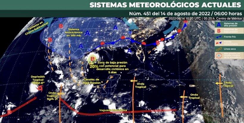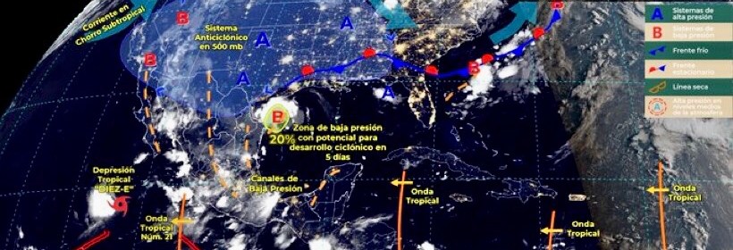 Para hoy, el monzón mexicano sobre el noroeste de México, ocasionará lluvias puntuales intensas con posibles granizadas en Sinaloa y puntuales muy fuertes en Baja California Sur, Sonora, Chihuahua y Durango, que podrían originar incremento en los niveles de ríos y arroyos, inundaciones y deslaves en zonas bajas, así como lluvias puntuales fuertes en Baja California. Por otra parte, sobre el noreste del territorio nacional se desplazará una zona de baja presión con potencial ciclónico, la cual originará lluvias puntuales intensas Nuevo León y Tamaulipas y muy fuertes en Coahuila y San Luis Potosí, que podrían originar incremento en los niveles de ríos y arroyos, inundaciones y deslaves en zonas bajas. La depresión tropical “Diez-E” en el océano Pacífico, se desplazará al suroeste de Península de Baja California y su circulación generará oleaje de 1.5 a 2.5 metros de altura en las costas de Baja California Sur. Canal de baja presión sobre el occidente, centro y sur del territorio nacional, en interacción con la onda tropical Núm. 21 que se desplazará al suroeste de las costas de Jalisco y con inestabilidad en niveles altos de la atmósfera, originarán lluvias puntuales intensas en Nayarit y puntuales muy fuertes en Zacatecas, Aguascalientes, Jalisco, Michoacán, Guanajuato, Querétaro y Estado de México, que podrían originar incremento en los niveles de ríos y arroyos, inundaciones y deslaves en zonas bajas, así como puntuales fuertes en Colima, Hidalgo, Tlaxcala, Morelos y Ciudad de México. Canales de baja presión sobre la Península de Yucatán, y en el oriente y sureste del territorio nacional, en combinación con la entrada de humedad proveniente del Golfo de México y Mar Caribe, producirán lluvias puntuales muy fuertes en Puebla, Oaxaca y Chiapas, puntuales fuertes en Veracruz y chubascos en Tabasco, Campeche, Yucatán y Quintana Roo. Finalmente, se mantendrá el ambiente vespertino cálido a caluroso en la mayor parte del país, con temperaturas máximas muy calurosas, superiores a los 40 °C en Baja California y Sonora.