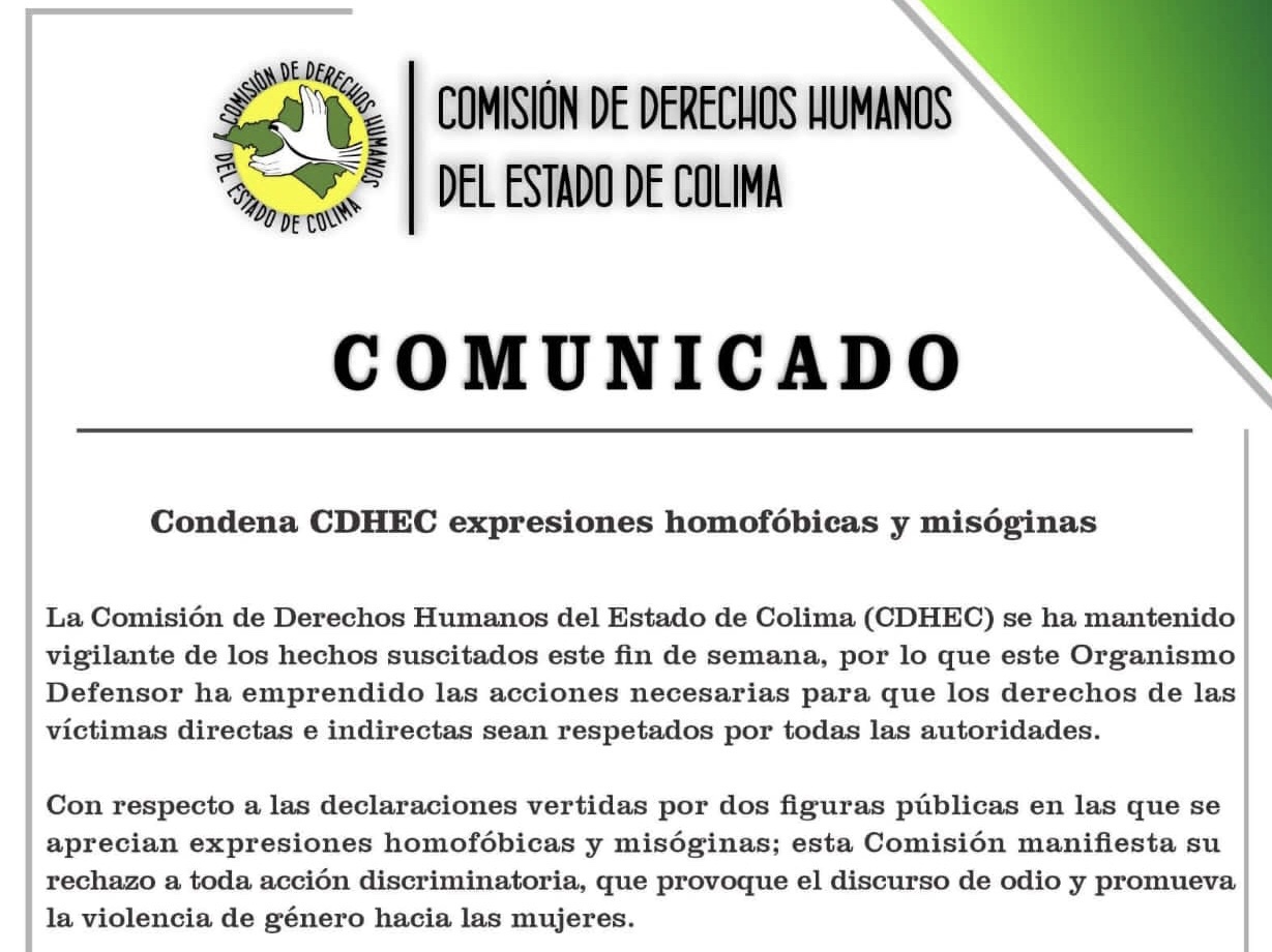 📌La Comisión de Derechos Humanos del Estado de Colima (CDHEC) se ha mantenido vigilante de los hechos suscitados este fin de semana, por lo que este Organismo Defensor ha emprendido las acciones necesarias para que los derechos de las víctimas directas e indirectas sean respetados por todas las autoridades.