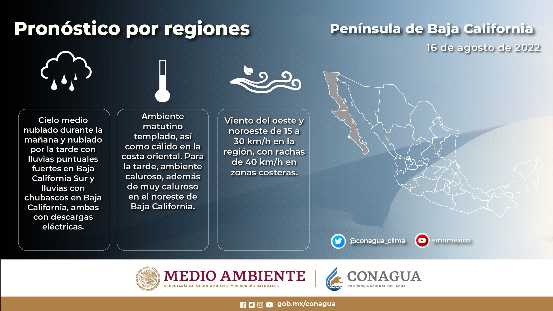 El #SMNmx te informa las condiciones del tiempo que prevé para este martes en la #PenínsulaDeBajaCalifornia y los estados del #Pacífico mexicano. Se esperan #Lluvias a lo largo del día, así que no olvides el paraguas.