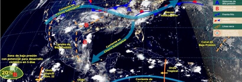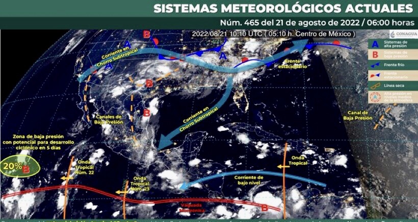 Este día, los remanentes del potencial ciclón tropical “Cuatro” se localizarán sobre el noreste del territorio nacional, propiciando lluvias puntuales muy fuertes en Coahuila, así como chubascos en Nuevo León, Tamaulipas y San Luis Potosí. Asimismo, el monzón mexicano se mantendrá sobre el noroeste de la República Mexicana y ocasionará lluvias fuertes a puntuales muy fuertes en zonas de Sonora, Chihuahua, Durango y Sinaloa, además de chubascos en la Península de Baja California. A su vez, la onda tropical Núm. 23 se desplazará sobre el occidente del territorio mexicano y en combinación con inestabilidad en niveles altos de la atmósfera, originarán lluvias de fuertes a puntuales muy fuertes en entidades del occidente y sur de la República Mexicana. Canales de baja presión sobre la Mesa del Norte, la Mesa Central y el sureste del país, aunado a la entrada de humedad del Golfo de México y Mar Caribe e inestabilidad en niveles altos de la atmósfera, originarán chubascos y lluvias puntuales muy fuertes con posible caída de granizo en las regiones mencionadas, incluidos el Valle de México y la Península de Yucatán. Las lluvias anteriormente mencionadas, estarán acompañadas de descargas eléctricas, rachas de viento y posible caída de granizo, además dichas lluvias podrían incrementar los niveles de ríos y arroyos, así como ocasionar deslaves e inundaciones. Prevalecerá ambiente vespertino caluroso a muy caluroso sobre entidades del noroeste, norte y noreste del país, así como en la Península de Yucatán, con temperaturas que podrán superar los 40°C en Baja California, Nuevo León, Tamaulipas y Campeche.