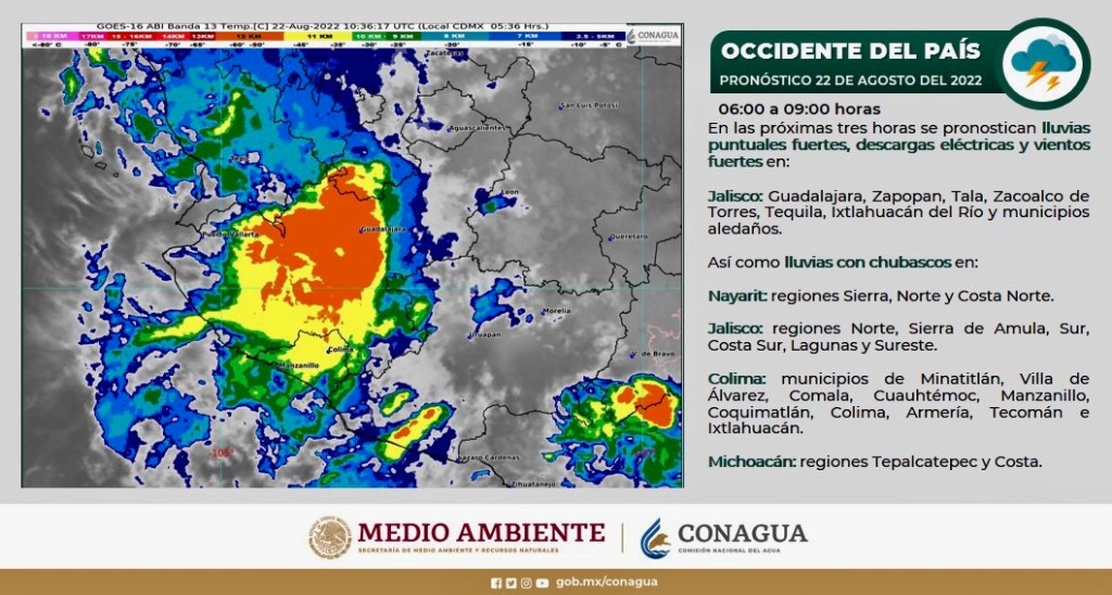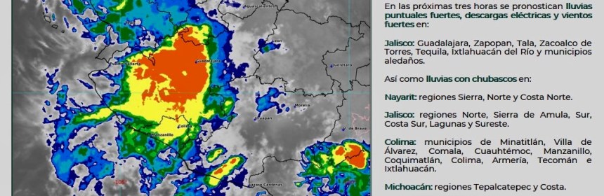 En las próximas tres horas se pronostican #Lluvias puntuales fuertes, #DescargasEléctricas y #Vientos fuertes en: #Jalisco. Así como #Lluvias con #Chubascos en Regiones de #Nayarit, #Jalisco y #Michoacán, y Municipios de #Colima.