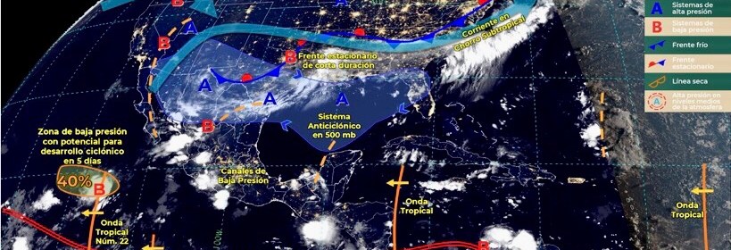 Este día, el monzón mexicano se mantendrá sobre el noroeste del país, en interacción con un frente estacionario (fuera de temporada) en el norte de México, producirá lluvias puntuales intensas con tormentas eléctricas y posibles granizadas en Sonora y Chihuahua, así como lluvias muy fuertes en Coahuila, Durango y Sinaloa, mismas que podrían ocasionar incremento en los niveles de ríos y arroyos, deslaves e inundaciones. Canales de baja presión y la entrada de humedad proveniente de ambos océanos, generarán lluvias fuertes, descargas eléctricas y posible caída de granizo en el occidente, centro, sur y sureste del territorio nacional, además de lluvias puntuales muy fuertes en Nayarit, Jalisco, Michoacán, Oaxaca y Chiapas. Una nueva onda tropical se aproximará a la Península de Yucatán e incrementará la probabilidad de chubascos y descargas eléctricas en Campeche, Yucatán y Quintana Roo. Finalmente, prevalecerá el ambiente vespertino cálido a caluroso sobre la mayor parte de la República Mexicana con temperaturas máximas superiores a 40°C en zonas de Baja California, Sonora, Nuevo León, Tamaulipas y Campeche.