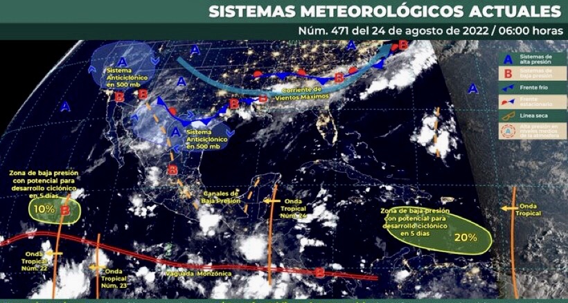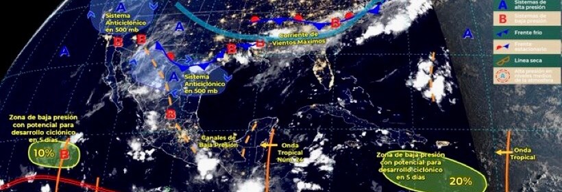 Para hoy, el monzón mexicano se mantendrá sobre el noroeste del territorio nacional, continuará interactuando con un sistema frontal(fuera de temporada) sobre la frontera norte de México y ambos sistemas generarán lluvias puntuales fuertes en Sinaloa y Nuevo León, puntuales muy fuertes en Sonora, Chihuahua, Coahuila y Durango, todas con posibles granizadas, además de chubascos en la Península de Baja California. Canales de baja presión en el interior del país, en combinación con el ingreso de humedad proveniente de ambos océanos, originarán lluvias puntuales fuertes a muy fuertes acompañadas de descargas eléctricas y posibles granizadas sobre entidades del occidente, sur, y sureste mexicano, así como chubascos y lluvias puntuales fuertes en el noreste, centro y oriente del territorio, incluido el Valle de México. El ingreso y avance de la onda tropical Núm. 24, sobre la Península de Yucatán, producirá lluvias fuertes en zonas de Campeche, Yucatán y Quintana Roo. Finalmente, persistirá el ambiente vespertino cálido a caluroso sobre la mayor parte de la República Mexicana, con temperaturas máximas muy calurosas, superiores a 40°C en zonas de Baja California, Sonora, Nuevo León y Tamaulipas.