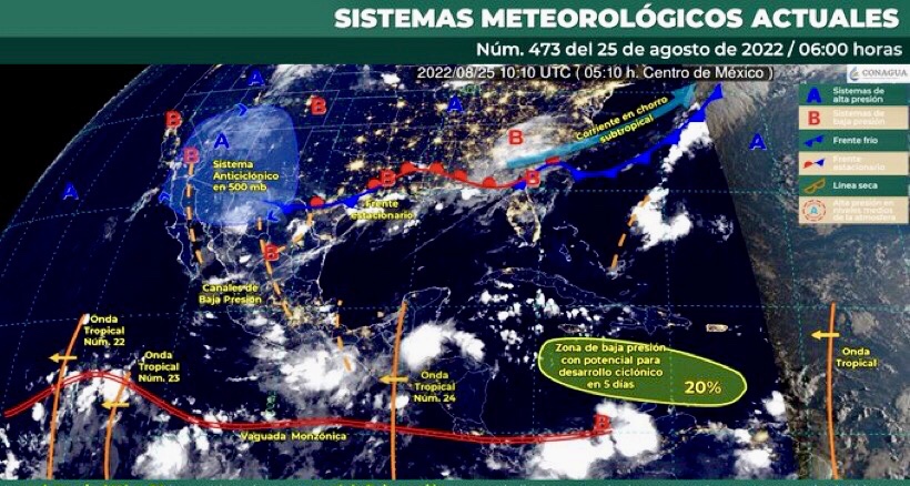 Este día, la onda tropical Núm. 24 se desplazará sobre el sureste del territorio nacional e interaccionará con un canal de baja presión sobre el suroeste del Golfo de México, generando lluvias puntuales intensas en Oaxaca, Veracruz (sur), Chiapas y Tabasco, muy fuertes en Campeche, así como fuertes en Yucatán y Quintana Roo. El frente estacionario (fuera de temporada) originará chubascos en zonas del noreste de México. Un segundo canal de baja presión interaccionará con el ingreso de humedad proveniente de ambos océanos, originará chubascos y lluvias fuertes sobre entidades del norte, occidente y centro del país, incluido el Valle de México. El monzón mexicanose mantendrá sobre el noroeste de México y propiciará lluvias fuertes a muy fuertes, descargas eléctricas y posible caída de granizo en Sonora, Chihuahua, Durango y Sinaloa; condiciones que podrían ocasionar el incremento en los niveles de ríos y arroyos, deslaves e inundaciones en dicha región. También, se pronostica ambiente vespertino cálido a caluroso en la mayor parte de la República Mexicana, y muy caluroso con temperaturas superiores a 40°C en zonas de Baja California, Sonora, Coahuila, Nuevo León y Tamaulipas.