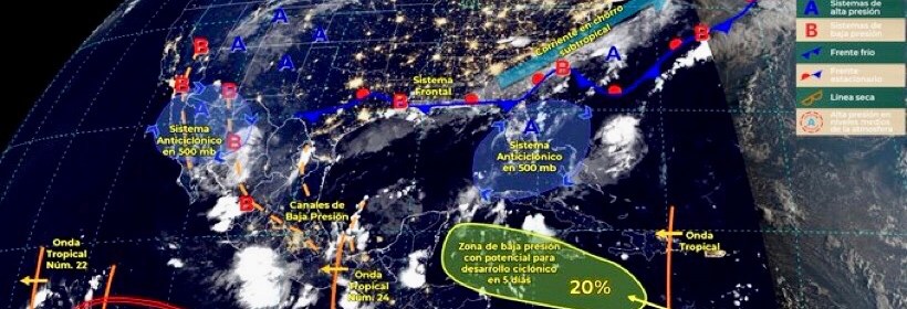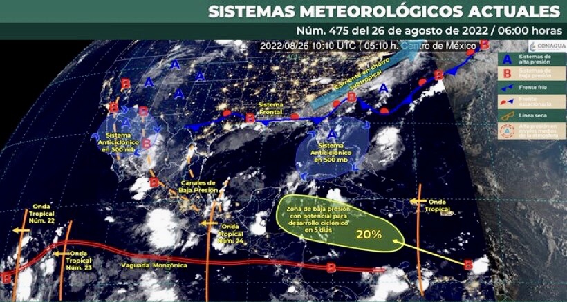 Para hoy, el monzón mexicano que se mantendrá en el noroeste de México, producirá lluvias puntuales intensas en Sonora, Sinaloa, Chihuahua y Durango, así como puntuales fuertes en Baja California Sur; todas acompañadas de descargas eléctricas y posibles granizadas, mismas que podrían generar incremento en los niveles de ríos y arroyos, deslaves e inundaciones en zonas bajas. Por otra parte, un canal de baja presión que se extenderá desde la Sierra Madre Occidental hasta la Mesa Central y la onda tropical Núm. 24 que recorrerá el sur del litoral del Pacífico, en interacción con inestabilidad en la atmósfera superior, producirán chubascos y lluvias puntuales fuertes en entidades del centro, así como lluvias puntuales muy fuertes sobre el occidente y sur del territorio nacional, con lluvias puntuales intensas en Nayarit y Jalisco. Otro canal de baja presión en el suroeste del Golfo de México producirá lluvias puntuales fuertes a muy fuertes sobre entidades del noreste, oriente y sureste del territorio nacional, incluida la Península de Yucatán, con lluvias puntuales intensas en Chiapas. Las lluvias mencionadas se acompañarán de descargas eléctricas, fuertes rachas de viento y posible caída de granizo. Finalmente, se pronostica ambiente vespertino cálido a caluroso en la mayor parte de la República Mexicana, con temperaturas máximas muy calurosas, superiores a 40°C en zonas de Baja California, Sonora y Tamaulipas.