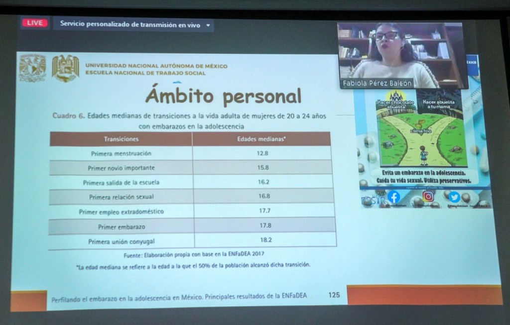 Fabiola Pérez Baleón, académica de la UNAM, impartió la videoconferencia “Para mí es todo lo que tengo. Práctica y significados asociados al embarazo, maternidad y paternidad en la adolescencia”, con datos de una investigación que desarrolló en torno a hombres y mujeres con un embarazo antes de los 20 años, en la Ciudad de México, el Estado de México y Puebla.