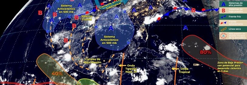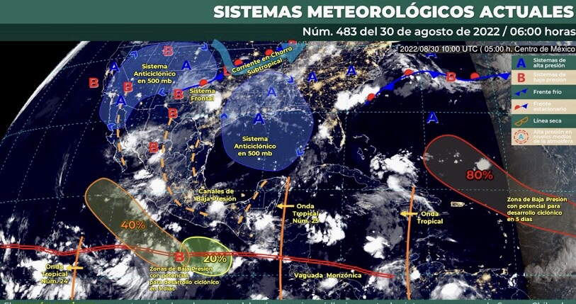 Para hoy el monzón mexicano se mantendrá sobre el noroeste del país y ocasionará lluvias puntuales intensas en zonas de Sonora, Chihuahua, Durango y Sinaloa. Por otra parte, canales de baja presión sobre el noreste, centro y occidente de México producirán lluvias puntuales intensas en Coahuila y muy fuertes en Nuevo León, Nayarit, Jalisco, Guanajuato, Estado de México, Michoacán y Guerrero. La onda tropical No. 25 interaccionará con otro canal de baja presión en el sureste mexicano y Península de Yucatán y ambos originarán lluvias puntuales intensas en Chiapas, Campeche y Yucatán, así como puntuales muy fuertes en Oaxaca, Veracruz, Tabasco y Quintana Roo; todas estas precipitaciones podrían acompañarse de descargas eléctricas y rachas de viento, además de que podrían incrementar los niveles de ríos y arroyos y ocasionar deslaves e inundaciones en zonas bajas de las entidades mencionadas. Finalmente, prevalecerá ambiente vespertino cálido a caluroso en gran parte de los estados de la República Mexicana, con temperaturas máximas muy calurosas, superiores a 40°C, en zonas de Baja California y Sonora.