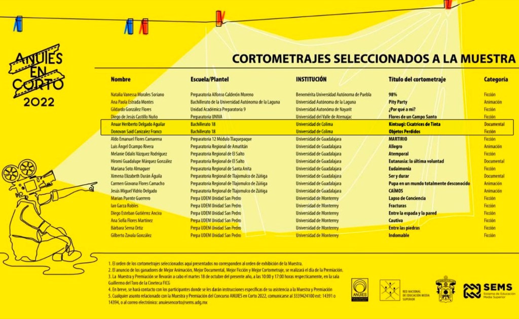 La Red Nacional de Educación Media Superior y el Sistema de Educación Media Superior de la Universidad de Guadalajara, dieron a conocer la lista de los 20 mejores cortometrajes seleccionados para presentarse en la Muestra Nacional de ANUIES en Corto 2022, entre los que destacan dos producciones hechas por alumnos del Bachillerato 18 de la Universidad de Colima: Anuar Heriberto Delgado Aguilar, con “Kintsugi: Cicatrices de Tinta” y Donovan Said Canizales Franco, con “Objetos Perdidos”