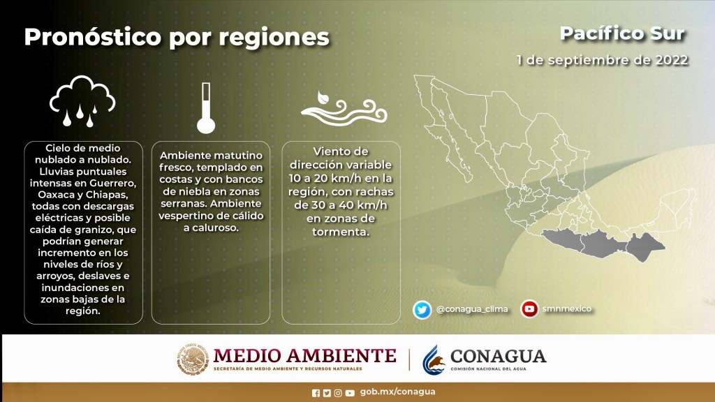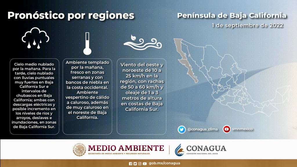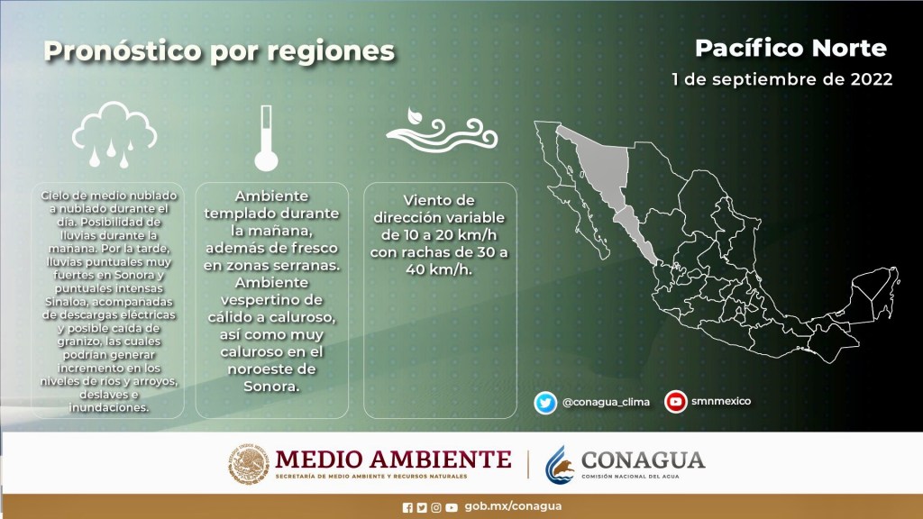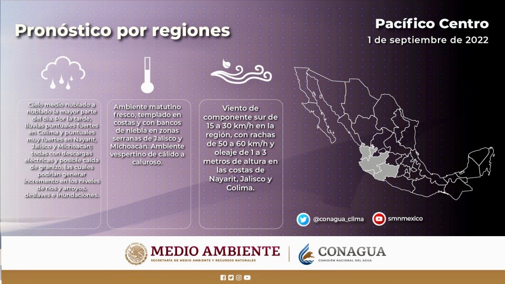Consulta las condiciones del tiempo que predominarán este jueves en las regiones del #Pacífico norte, centro y sur, así como en la #PenínsulaDeBajaCalifornia. Da clic en cada uno de los gráficos para más detalles