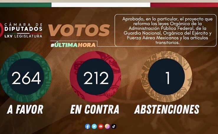 De esta forma, con dispensa de trámites y de manera fast track, y con el voto en contra del PAN, PRI, PRD y Movimiento Ciudadano, los morenistas y sus aliados avalaron cambios a la Ley Orgánica de la Administración Pública Federal, Ley de la Guardia Nacional y Ley Orgánica del Ejército y Fuerza Aérea Mexicanos.