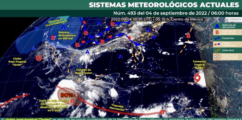 Este día, el ciclón post-tropical “Javier” continuará debilitándose y alejándose de las costas de Baja California; sin embargo, la circulación del sistema generará lluvias e intervalos de chubascos en dicha península, además de oleaje elevado y rachas de viento de hasta 50 km/h en sus costas. El monzón mexicano sobre el noroeste del país, ocasionará lluvias muy fuertes con posibles granizadas en Chihuahua, Sinaloa y Durango, así como chubascos en Sonora. Un posible ciclón tropical se localizará al sur de las costas de Guerrero y Michoacán, continuará interactuando con un canal de baja presión sobre el occidente y centro del país, así como con la vaguada monzónica ubicada muy cerca de las costas del Pacífico Sur y Central Mexicano; este sistema originará lluvias puntuales torrenciales en zonas de Michoacán y Guerrero; puntuales intensas en Jalisco, Colima y Oaxaca; puntuales muy fuertes en Nayarit; puntuales fuertes en Zacatecas, Guanajuato, Querétaro, Estado de México, Tlaxcala y Morelos e intervalos de chubascos en la Ciudad de México, así como viento con rachas de 70 a 80 km/h y oleaje de 2 a 4 metros de altura en las costas de Colima, Michoacán y Guerrero. Canales de baja presión prevalecerán sobre el noreste, oriente y sureste de la República Mexicana y la Península de Yucatán en interacción con el ingreso de humedad proveniente del Océano Pacífico y Mar Caribe, lo cual ocasionará lluvias puntuales intensas en zonas de Coahuila, Nuevo León, Hidalgo, Puebla y Veracruz; lluvias puntuales muy fuertes en Tamaulipas, San Luis Potosí y Chiapas; lluvias puntuales fuertes en Tabasco y Campeche, así como chubascos en Yucatán y Quintana Roo. Por otra parte, prevalecerá el ambiente vespertino caluroso a muy caluroso sobre entidades del noroeste y noreste del país, así como en los estados del litoral del Océano Pacífico y la Península de Yucatán, con temperaturas que podrán superar los 40°C en Baja California y Sonora.