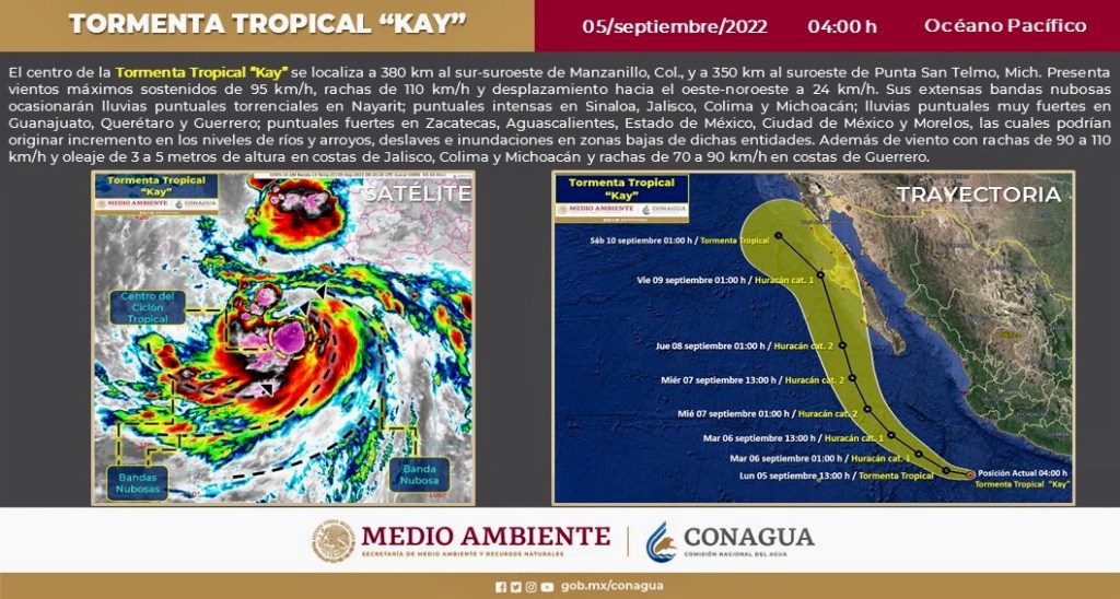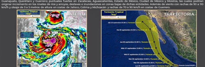 Kay se encuentra como #TormentaTropical a 380 km al sur suroeste de Manzanillo, #Colima y a 350 km al suroeste de Punta San Telmo, #Michoacán. Ocasionará #Lluvias puntuales torrenciales en #Nayarit e intensas en #Colima