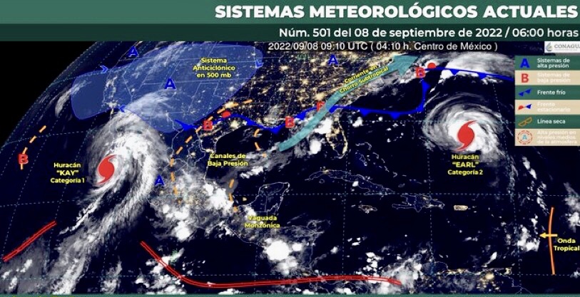 Este día, el centro del huracán “Kay” se desplazará muy cerca de la costa occidental de los municipios de Comondú y Mulegé, B.C.S., sin descartar un posible impacto en Punta Eugenia, B.C.S.; sus bandas nubosas ocasionarán lluvias puntuales extraordinarias en la Península de Baja California, lluvias intensas en Sonora y lluvias muy fuertes en Sinaloa. También, se pronostican vientos fuertes con rachas de 120 a 150 km/h, marea de tormenta y olas de 7 a 9 metros de altura significativa en la costa oeste de Baja California y Baja California Sur, además de oleaje de 2 a 4 metros en el Golfo de California y en el litoral de Sonora. Un canal de baja presión se ubicará sobre el norte y centro del Golfo de México, incrementando la probabilidad de lluvias muy fuertes a intensas en el oriente y sureste mexicano, incluida la Península de Yucatán, además, se pronostica viento de componente norte con rachas de 40 a 50 km/h en las costas de Tamaulipas y Veracruz. Canales de baja presión sobre el occidente y centro del país, en combinación con la entrada de humedad del Océano Pacífico, producirá lluvias puntuales muy fuertes en Michoacán y Morelos, así como lluvias puntuales fuertes en el Estado de México, Ciudad de México y Tlaxcala. Por otra parte, se prevé ambiente vespertino caluroso sobre entidades del occidente de México y en la Península de Yucatán.