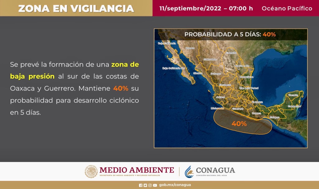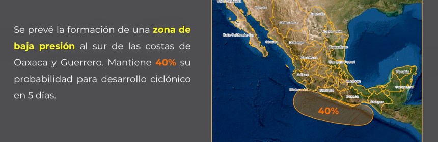 40% de probabilidad para desarrollar un Ciclón Tropical en 5 días. Publicado el 11 septiembre, 2022 por Análisis Colima Deja un comentario La formación de una zona de #BajaPresión al sur de las costas de #Oaxaca y #Guerrero, mantiene a 40% su probabilidad para desarrollar un #CiclónTropical en 5 días. Compártelo: Haz clic para compartir en Facebook (Se abre en una ventana nueva) Facebook Haz clic para compartir en X (Se abre en una ventana nueva) X Haz clic para compartir en WhatsApp (Se abre en una ventana nueva) WhatsApp Haz clic para imprimir (Se abre en una ventana nueva) Imprimir Haz clic para enviar un enlace por correo electrónico a un amigo (Se abre en una ventana nueva) Correo electrónico Etiquetado con Reporte del clima Clima Nacional Noticias Noticias Colima
