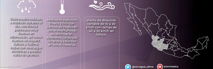 Condiciones del tiempo para hoy jueves en regiones del Pacífico Centro. Publicado el 15 septiembre, 2022 por Análisis Colima Deja un comentario Se prevén para zonas de Colima lluvias puntuales fuertes, con descargas eléctricas y posible caída de granizo. Compártelo: Haz clic para compartir en Facebook (Se abre en una ventana nueva) Facebook Haz clic para compartir en X (Se abre en una ventana nueva) X Haz clic para compartir en WhatsApp (Se abre en una ventana nueva) WhatsApp Haz clic para imprimir (Se abre en una ventana nueva) Imprimir Haz clic para enviar un enlace por correo electrónico a un amigo (Se abre en una ventana nueva) Correo electrónico Etiquetado con Reporte del clima Clima Edos y Municipios Noticias Noticias Colima