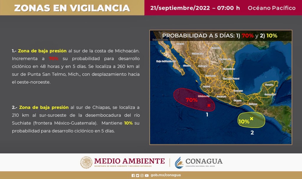Zonas de Baja Presión en el océano Pacífico con probabilidad de desarrollo ciclónico.