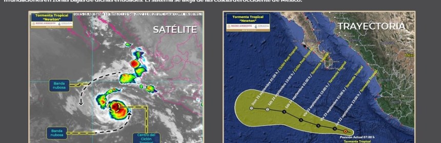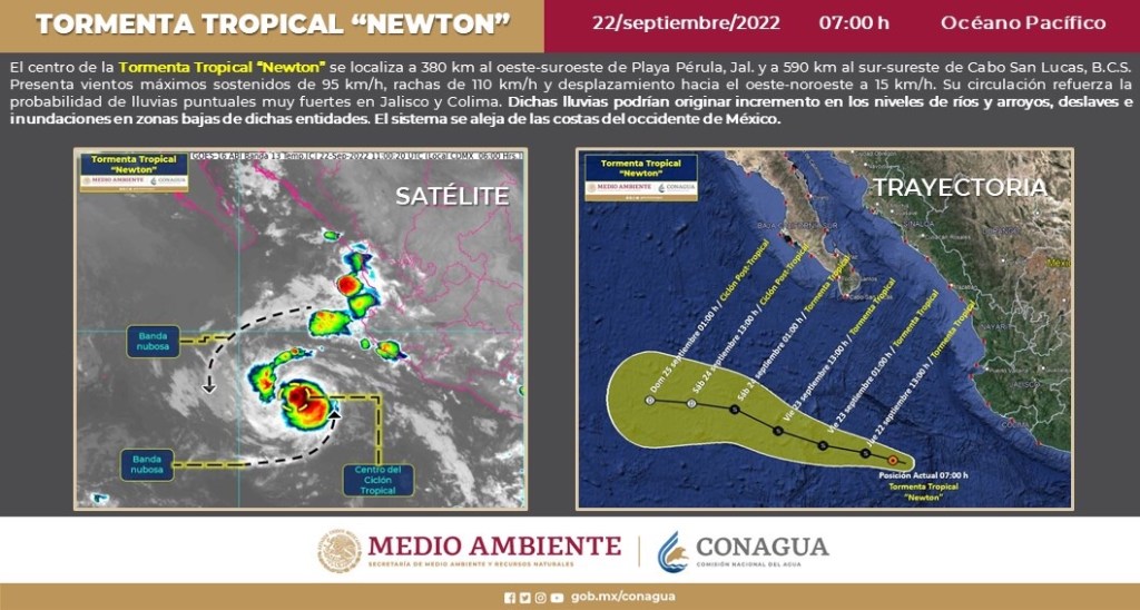 La #TormentaTropical #Newton se localiza a 380 km al oeste-suroeste de Playa Pérula, #Jalisco. Sus bandas nubosas mantendrán condiciones para #Lluvias muy fuertes en #Jalisco y #Colima. Detalles en el gráfico