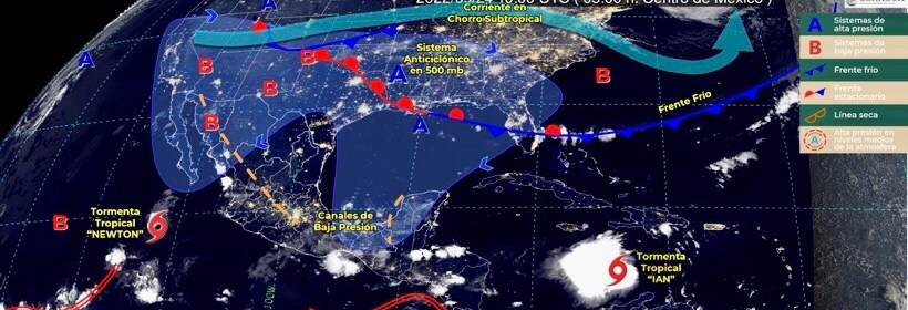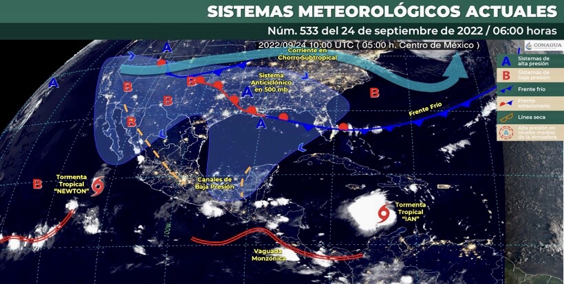 Este día, un canal de baja presión sobre el noroeste, occidente y centro del territorio nacional, en interacción con la humedad proveniente del Océano Pacífico y del Golfo de México, ocasionarán chubascos vespertinos y lluvias fuertes en dichas regiones, además de la Península de Baja California. Los siguientes sistemas: un segundo canal de baja presión sobre el suroeste del Golfo de México y el sureste del país; la vaguada monzónica próxima a las costas del Pacífico Sur Mexicano; el ingreso de humedad del Golfo de México y Mar Caribe e inestabilidad atmosférica superior, provocarán lluvias puntuales intensas en zonas de Oaxaca y Chiapas; puntuales muy fuertes en Guerrero, Puebla, Veracruz y Tabasco; además de chubascos y lluvias fuertes en zonas del oriente, sur y sureste del territorio mexicano, incluida la Península de Yucatán. Durante la noche, se prevé la proximidad de un frente frío, el cual ocasionará vientos fuertes con rachas de 50 a 60 km/h y posibles tolvaneras, además de incrementar el potencial de chubascos y lluvias fuertes con descargas eléctricas sobre Sonora y Baja California. Una circulación anticiclónica en niveles medios de la atmósfera mantendrá bajo potencial de lluvias sobre entidades de la Mesa del Norte y noreste del país. Así mismo, continuará el ambiente vespertino caluroso a muy caluroso con temperaturas superiores a 35°C en zonas del noroeste y noreste de la República Mexicana, además de la Península de Yucatán.