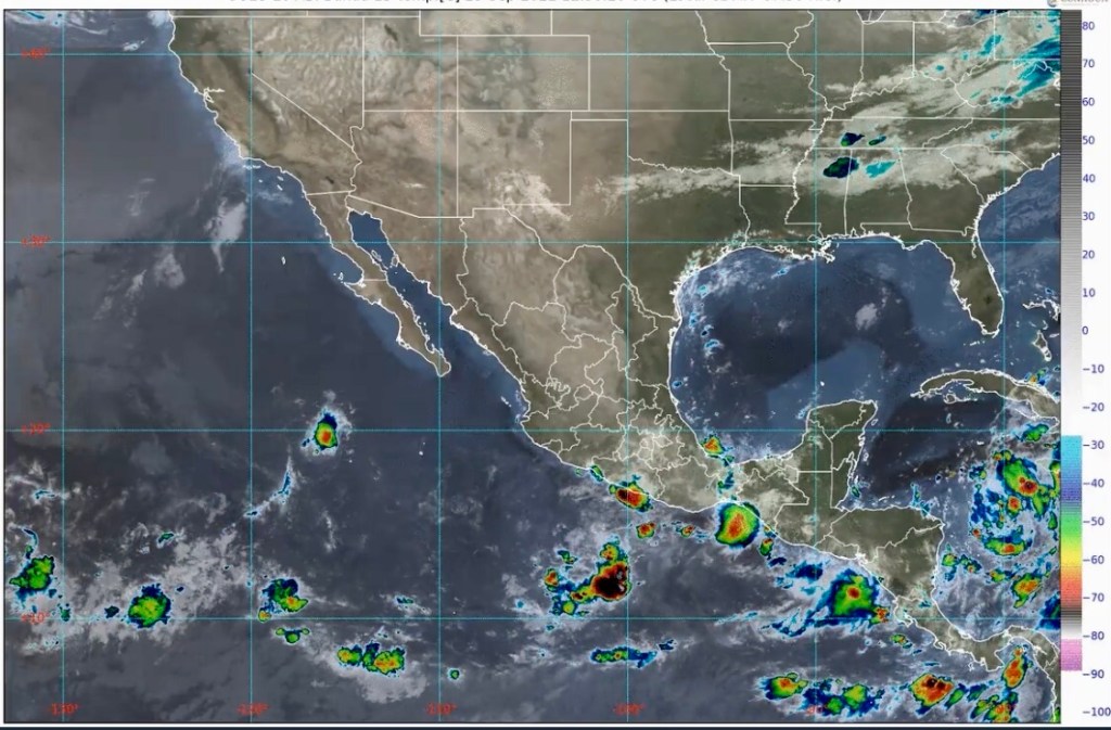 Pacífico Centro: Cielo medio nublado por la mañana y nublado durante la tarde con lluvias puntuales fuertes en Michoacán e intervalos de chubascos en Nayarit, Jalisco y Colima; todas con descargas eléctricas. Ambiente matutino fresco, con bancos de niebla en zonas serranas de Jalisco y Michoacán. Ambiente cálido por la tarde y caluroso en zonas costeras. Viento de componente oeste de 10 a 25 km/h en la región, con rachas de 40 a 50 km/h en costas de Jalisco.