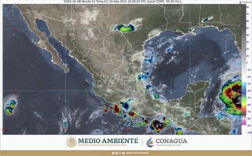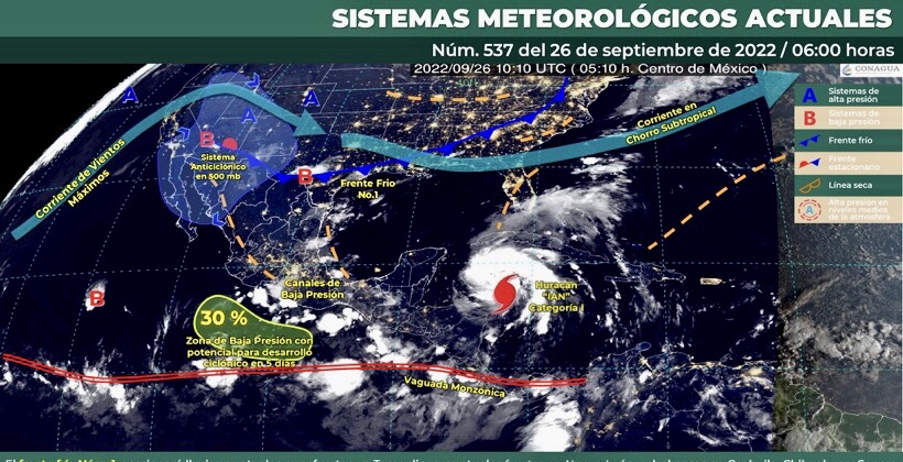 Este día, el frente frío Núm. 1 sobre el norte y noreste de México, ocasionará lluvias puntuales muy fuertes en Tamaulipas; puntuales fuertes en Nuevo León y chubascos en Coahuila, Chihuahua y Sonora; todas con descargas eléctricas. La masa de aire fría que impulsa al frente producirá ligero descenso de temperatura en zonas de los estados fronterizos del norte de México, rachas de viento de 60 a 70 km/h con tolvaneras en Sonora; y de 50 a 60 km/h en Tamaulipas, mismas que se acompañarán de posibles tolvaneras en Nuevo León, Coahuila, Chihuahua y Baja California. Un canal de baja presión sobre el suroeste del Golfo de México y el sureste del país, interaccionará con la vaguada monzónica que se extenderá muy próxima a las costas de Chiapas, originando lluvias puntuales intensas en zonas de Veracruz, Oaxaca y Chiapas; así como puntuales muy fuertes en Tabasco. Un segundo canal de baja presión sobre el occidente de la República Mexicana, en combinación con el ingreso de humedad proveniente del Océano Pacífico, ocasionarán lluvias puntuales intensas en Puebla, Hidalgo y San Luis Potosí; puntuales muy fuertes en Guerrero y Querétaro; además de lluvias puntuales fuertes en Tlaxcala, Morelos, Estado de México, Ciudad de México, Guanajuato, Michoacán, Colima y Jalisco. Asimismo, continuará el ambiente vespertino cálido en gran parte de las entidades del país, así como temperaturas muy calurosas, superiores a 40 °C, en el noreste de Baja California y noroeste de Sonora. La aproximación del huracán “Ian” originará el flujo de aire húmedo del Mar Caribe hacia costas de la Península de Yucatán, generando lluvias puntuales muy fuertes en Quintana Roo y Yucatán, así como lluvias puntuales fuertes en Campeche; rachas de viento de 60 a 70 km/h y oleaje de 2 a 3 metros de altura, sobre costas de Quintana Roo y Yucatán.