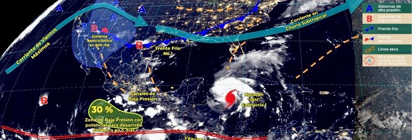Este día, el frente frío Núm. 1 sobre el norte y noreste de México, ocasionará lluvias puntuales muy fuertes en Tamaulipas; puntuales fuertes en Nuevo León y chubascos en Coahuila, Chihuahua y Sonora; todas con descargas eléctricas. La masa de aire fría que impulsa al frente producirá ligero descenso de temperatura en zonas de los estados fronterizos del norte de México, rachas de viento de 60 a 70 km/h con tolvaneras en Sonora; y de 50 a 60 km/h en Tamaulipas, mismas que se acompañarán de posibles tolvaneras en Nuevo León, Coahuila, Chihuahua y Baja California. Un canal de baja presión sobre el suroeste del Golfo de México y el sureste del país, interaccionará con la vaguada monzónica que se extenderá muy próxima a las costas de Chiapas, originando lluvias puntuales intensas en zonas de Veracruz, Oaxaca y Chiapas; así como puntuales muy fuertes en Tabasco. Un segundo canal de baja presión sobre el occidente de la República Mexicana, en combinación con el ingreso de humedad proveniente del Océano Pacífico, ocasionarán lluvias puntuales intensas en Puebla, Hidalgo y San Luis Potosí; puntuales muy fuertes en Guerrero y Querétaro; además de lluvias puntuales fuertes en Tlaxcala, Morelos, Estado de México, Ciudad de México, Guanajuato, Michoacán, Colima y Jalisco. Asimismo, continuará el ambiente vespertino cálido en gran parte de las entidades del país, así como temperaturas muy calurosas, superiores a 40 °C, en el noreste de Baja California y noroeste de Sonora. La aproximación del huracán “Ian” originará el flujo de aire húmedo del Mar Caribe hacia costas de la Península de Yucatán, generando lluvias puntuales muy fuertes en Quintana Roo y Yucatán, así como lluvias puntuales fuertes en Campeche; rachas de viento de 60 a 70 km/h y oleaje de 2 a 3 metros de altura, sobre costas de Quintana Roo y Yucatán.