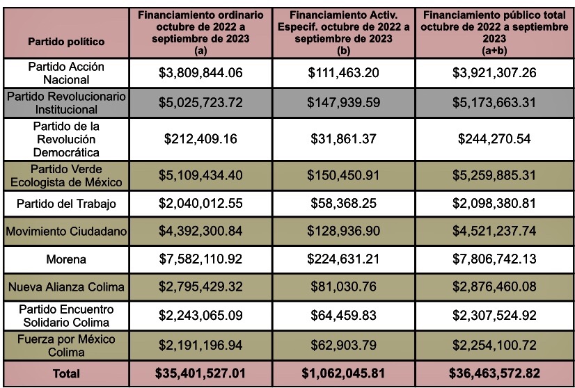 Distribuirá IEE Colima 36,463,572.82 de financiamiento para partidos políticos.