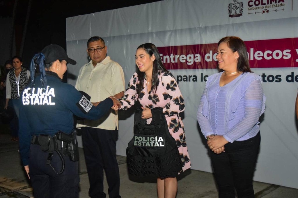 Muy temprano este miércoles, la gobernadora del estado de Colima, Indira Vizcaíno Silva, visitó las instalaciones de la Policía Estatal Preventiva (PEP), donde acompañada por la secretaria general de Gobierno, Ma Guadalupe Solís Ramírez, y el secretario de Seguridad Pública, Héctor Alfredo Castillo Báez, entregó 200 cascos y 350 chalecos balísticos con una inversión superior a 8 millones de pesos, para fortalecer la seguridad en esta entidad, así como lo hizo al inicio de su administración con la entrega de patrullas.