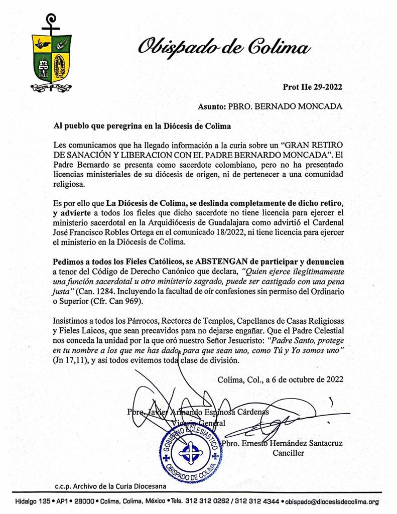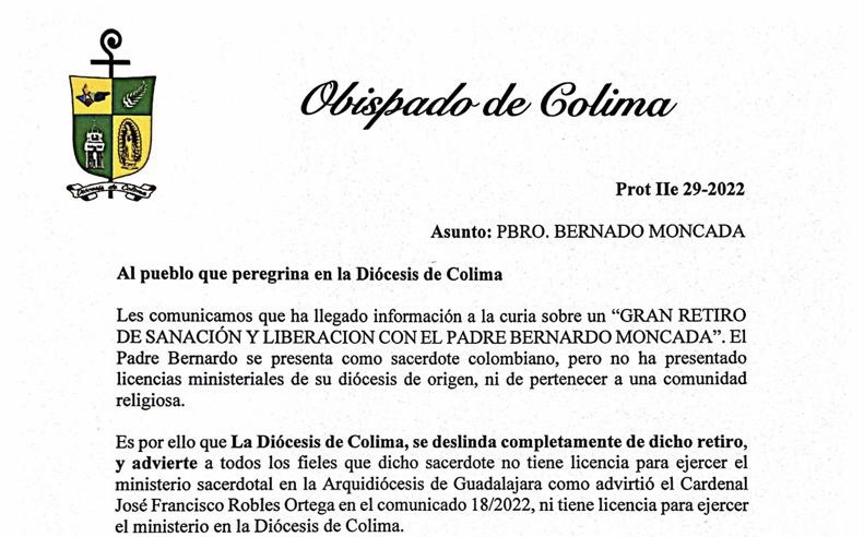 Es por ello que La Diócesis de Colima, se deslinda completamente de dicho retiro, y advierte a todos los fieles que, dicho sacerdote no tiene licencia para ejercer el ministerio sacerdotal en la Arquidiócesis de Guadalajara como advirtió el Cardenal José Francisco Robles Ortega en el comunicado 18/2022, ni tiene licencia para ejercer el ministerio en la Diócesis de Colima.