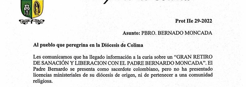 Les comunicamos que ha llegado información a la curia sobre un “GRAN RETIRO DE SANACIÓN Y LIBERACION CON EL PADRE BERNARDO MONCADA”. El Padre Bernardo se presenta como sacerdote colombiano, pero no ha presentado licencias ministeriales de su diócesis de origen, ni de pertenecer a una comunidad religiosa.