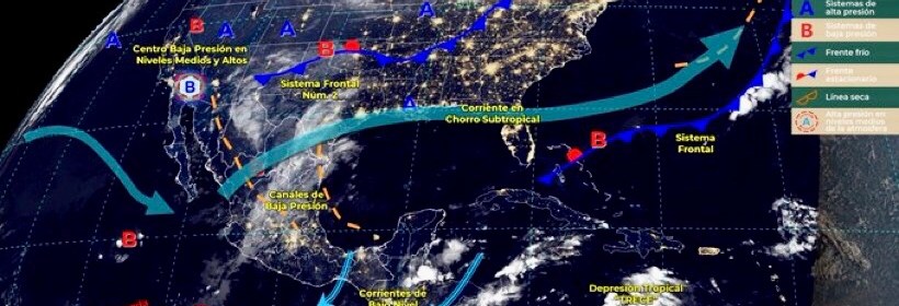 Durante este día, un centro de baja presión en el noroeste del territorio mexicano y la presencia del sistema frontal Núm. 2 con características de estacionario sobre el norte y noreste de México, originarán lluvias fuertes a muy fuertes acompañadas de descargas eléctricas y posibles granizadas en zonas de Sonora, Chihuahua, Nuevo León y Tamaulipas, así como ambiente frío en los estados de la Mesa del Norte. Por otro lado, canales de baja presión en el interior del territorio nacional en combinación con el ingreso de humedad proveniente del Océano Pacífico, Golfo de México y Mar Caribe, generarán lluvias fuertes en el occidente, centro, oriente, sur y sureste de la República Mexicana, con lluvias puntuales muy fuertes en Veracruz. Finalmente, se pronostica ambiente vespertino caluroso con temperaturas máximas de entre 35 y 40 °C en regiones de Baja California, Sonora, Yucatán y Quintana Roo.