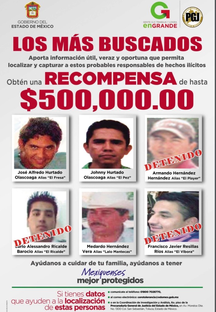 La Fiscalía General de Justicia del Estado de México ofrece una recompensa de hasta 500 mil pesos por información que lleve a su captura, debido a que se le considera un generador de violencia y se le vincula con diversas agresiones a servidores públicos de la policía estatal y de la propia fiscalía.