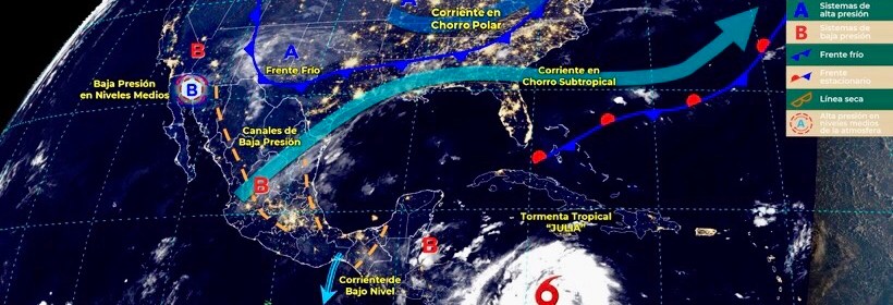 Para hoy, un centro de baja presión en niveles medios de la atmósfera sobre el noroeste de la República Mexicana, en interacción con la corriente en chorro subtropical y la aproximación de un nuevo frente frío a la frontera norte y noreste de México, favorecerán lluvias muy fuertes en Chihuahua, Tamaulipas y San Luis Potosí, así como lluvias fuertes en Sonora, Coahuila, Nuevo León y Durango, además de chubascos en el resto de las regiones; dichas lluvias estarán acompañadas de descargas eléctricas, rachas fuertes de viento y posible caída de granizo. Por otra parte, canales de baja presión sobre el occidente, oriente y sureste de la República Mexicana, aunados al ingreso de humedad del Océano Pacífico, Golfo de México y Mar Caribe, generarán lluvias intensas en Veracruz y Puebla, lluvias muy fuertes en Hidalgo, Tabasco, Oaxaca y Chiapas, lluvias fuertes en Querétaro y la Península de Yucatán, además de chubascos en el occidente, centro y sur del país, y lluvias aisladas en la Ciudad de México. Finalmente, se pronostica ambiente vespertino cálido a caluroso en el noroeste de México, así como en los estados del litoral del Océano Pacífico y la Península de Yucatán, con temperaturas de 35 a 40°C en la Península de Baja California, Sonora y Sinaloa.