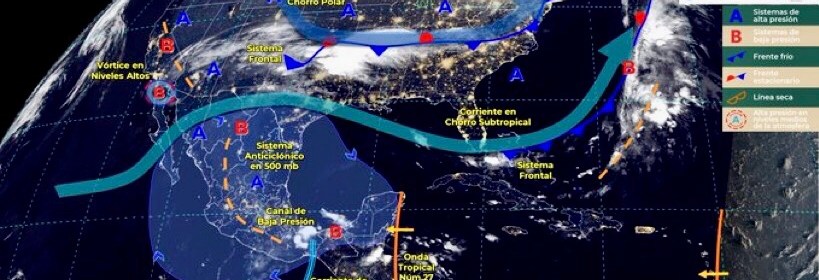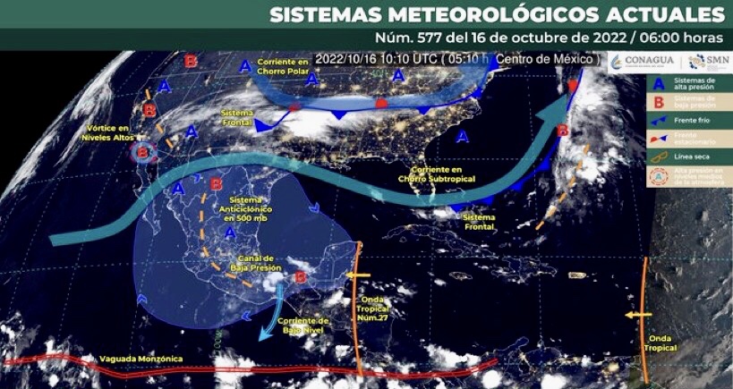 Un nuevo frente frío ingresará sobre la frontera norte de México, e interaccionará con un vórtice de baja presión en niveles medios de la atmósfera que se ubicará al noroeste del territorio nacional, ocasionarán lluvias puntuales fuertes acompañadas de descargas eléctricas y posible caída de granizo en Chihuahua y Sonora; chubascos con posibles descargas eléctricas y posible caída de granizo en Coahuila, además de lluvias aisladas en Baja California, Sinaloa, Nuevo León, Tamaulipas y San Luis Potosí, rachas de viento de 50 a 60 km/h se prevén en Chihuahua, Coahuila, Tamaulipas y Nuevo León, mismas que estarán acompañadas de posibles torbellinos o tornados en el norte de Chihuahua y Coahuila. Onda tropical Núm. 27 avanzará sobre la Península de Yucatán y en combinación con el ingreso de humedad del Golfo de México y Mar Caribe, originarán lluvias puntuales muy fuertes en Chiapas, Oaxaca y en el centro y sur de Veracruz, acompañadas de descargas eléctricas; además de chubascos con posibles descargas eléctricas en Tabasco y los estados de la Península de Yucatán. Asimismo, canal de baja presión y el ingreso de humedad del Océano Pacífico generará lluvias puntuales fuertes en Guerrero; chubascos en Jalisco, Michoacán, Hidalgo, Tlaxcala y Puebla, incluyendo al Valle de México; así mismo lluvias aisladas en Durango, Zacatecas, Colima, Nayarit y Morelos. Temperaturas vespertinas cálidas se presentarán en los estados costeros del Occidente, Golfo de México y Península de Yucatán. Finalmente, una circulación anticiclónica en niveles medios de la atmósfera originará ambiente estable y baja probabilidad de lluvias sobre entidades del Centro del territorio nacional.