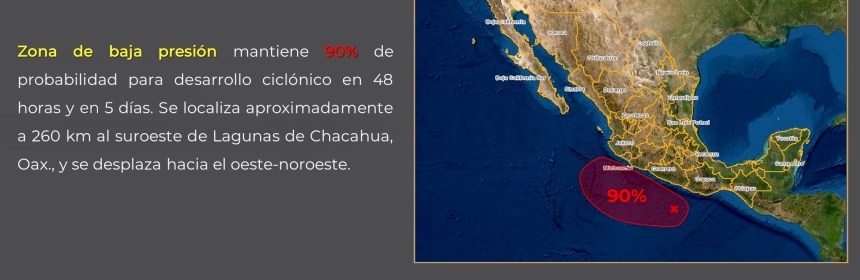 Zona de #BajaPresión tiene 90% de probabilidad para desarrollar un #CiclónTropical en el #Pronóstico a 48 horas, se localiza frente a las costas del #Pacífico Sur Mexicano. Se mantiene en vigilancia.